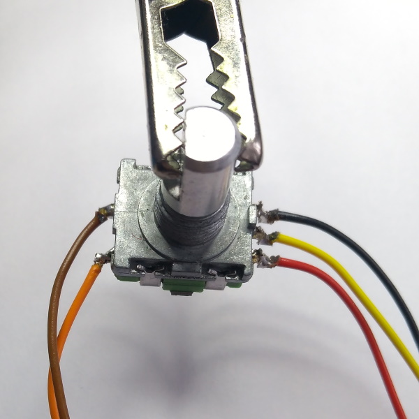 An den Encodern werden die Befestigungsnasen entfernt und die Lötkontakte umgebogen, so dass die Encoder aufgeklebt und die Kabel an den Kontakten angelötet werden können. Der Encoder wird dann in die Maske eingeklebt und mit Heißkleber weiter fixiert. Die Kabel werden ebenfalls mit Heißkleber befestift. Am anderen Ende sind Crimpkontakte angebracht, die dann in eine 5-polige Aufnahme gesteckt werden.