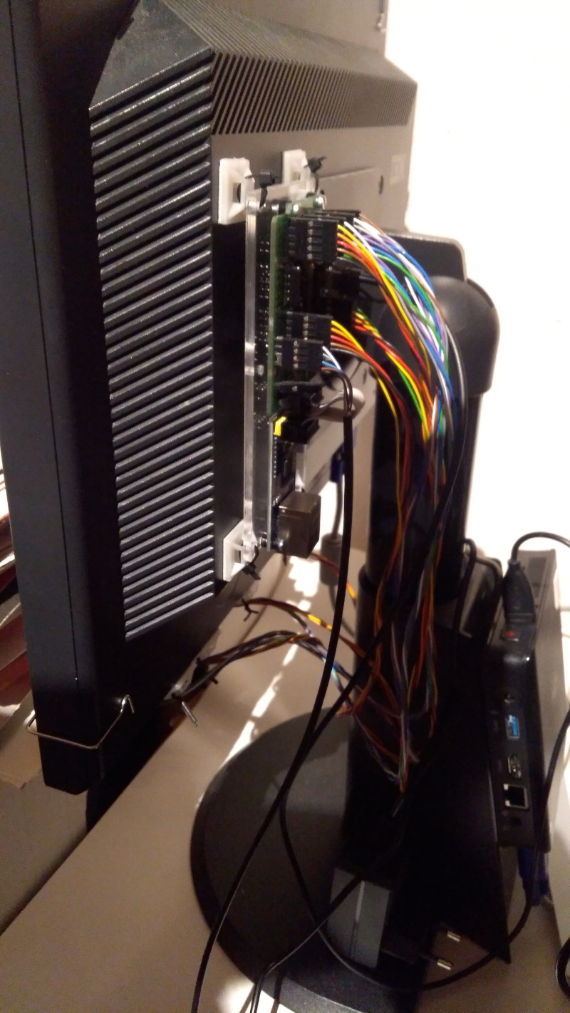 Die Schalter-Einheit soll links und rechts am Yoke angebaut werden. Die Erweiterung für die Schalter ist hinten an den Yoke angeschraubt und die Anschlussleitungen sind in kleinen Kabelkanälen zu den Schaltern geführt. Die Schaltererweiterung wird über ein 5-poliges I²C-Kabel (GND, 5P, SDA, SCL, INT) mit der Encoderbaugruppe am TFT-Panel verbunden.