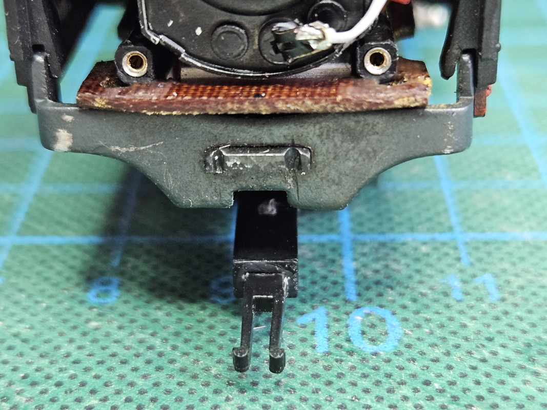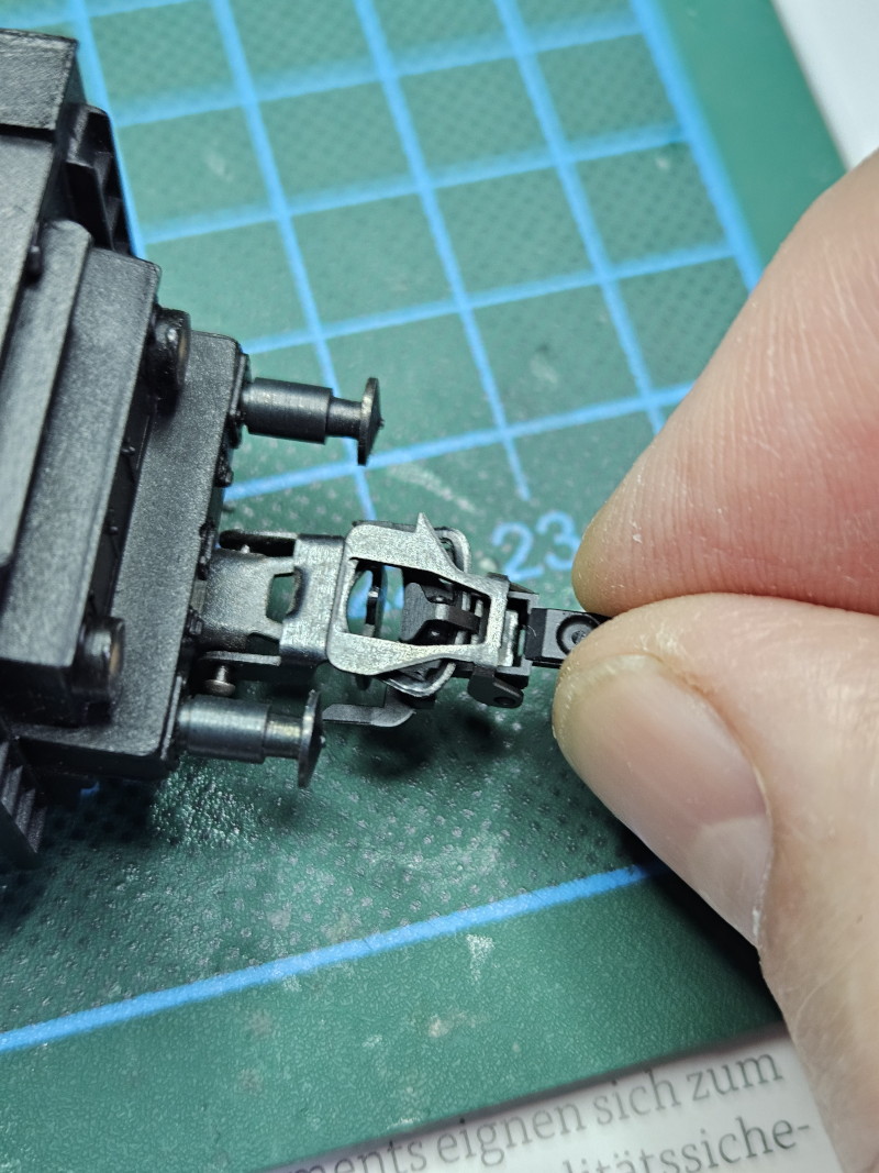 Die PIKO-Kupplung am Tender wurde so gelassen. Diese kuppelt gut mit den sonst verwendeten etwas neueren Märklin-Kurz-Kupplungen an den Wagen. Vorn ist noch den Haken.