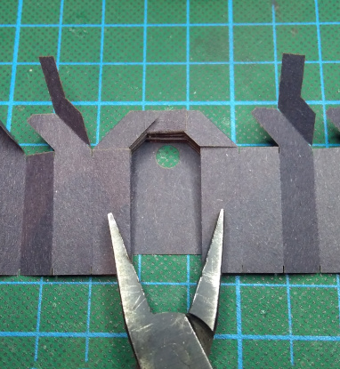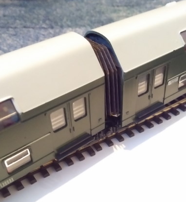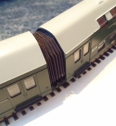 Mit dem originalen Faltenbalg gibt es insbesondere beim Gleiswechsel bei 15°-Weichen odwr bei S-Kurven mit direktem Übergang Probleme. Ich hatte den originalen Faltenbalg mit dessen Faltung mit dünnerem Papier nachgebaut, aber das funktionierte auch nicht. Nach mehreren Versuchen hat sich eine Variante mit zwei Faltungssträngen und einer Klebung oben in der Mitte nach jeweils einer Faltung als erfogversprechend gezeigt. Damit können jetzt auch im Schiebebetrieb S-Kurven mit Radius-545mm und Gleiswechsel mit 15°-Weichen durchfahren werden. Direkte Übergänge bei S-Kurven mit kleinerem Radius sollten vermieden werden. Bei R-380 raschelt der Balg. Da könnten dann Probleme auftreten.