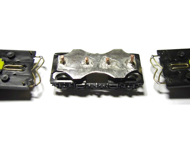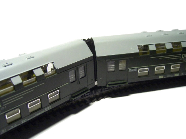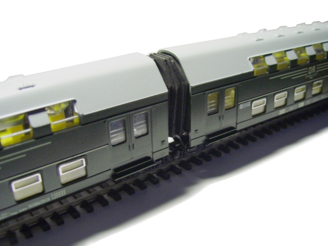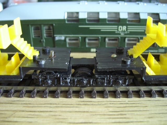Die Doppelstockwagen haben einen sehr langen Abstand zueinander. Da ich auf meiner Anlage recht kurzeZüge fahren lasse, habe ich eine zweiteilige Einheit umgebaut auf einen kürzeren Abstand. Auf das mittlere Drehgestell, auf dem beide Teile aufliegen, habe ich ein Blech geklebt und mit zwei Zapfen versehen. Aus Draht habe ich die eine Längsführung und die Kulisse gebogen. Die Wagenteile werden auf die beiden Führungszapfen aufgesetzt.