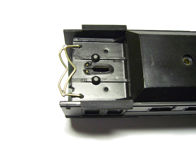Die eine Kontaktierung erfolgt über das mittlere Drehgestell und wird noch vorn geführt und die zweite Kontaktierung über das vordere Drehgestell. Dazu wurden Federn gebogen, die auf den Stiften aufliegen. So ist das Oberteil problemlos abnehmbar. Die Ansteuerung der LEDs erfolgt über einen ausgesonderten Lok-Dekoder.