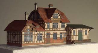 Irgendwann Anfang 2010 bin ich auf der Suche nach einem Bahnhofsvorbild aus dem Mittelgebirge über die Gleimo-Seite, Bahnhof Manebach auf die Seite von Jan Triphahn über den Bahnhof Loitz gestoßen. Leider sind beide Seiten nicht mehr online, ich zeige unten einige Bilder, die auf der Seite von Herrn Triphahn zu sehen waren. Ich habe mein Modell mal so hingestellt, wie auf den ersten Bild dargestellt. Von diesem Bahnhofstyp gibt es mehrere Ausführungen in Thüringen sowie auch in Meck-Pomm. Von diesem Bahnhof gibt es bereits einen Bogen von G.T. Petermann in 1:87 über den es einen Baubericht bei www.kartonbau.de gibt. Da mich eine Eigenkonstruktion interessierte, erhielt ich von Herrn Triphahn die Kopie der Bauzeichnung von 1906. Der Bahnhof hatte nach diesem Plan, und auch wie auf den Fotos von Herrn Triphahn zu sehen ist, im Original eine Loggia (ebenso der sehr ähnliche Bahnhof Stützerbach), es gab noch eine weitere Tür, die später zugemauert wurde und am Dach des Wartesaals gab es noch diverse Verzierungen. Der Güterschuppen wurde auch später erweitert.