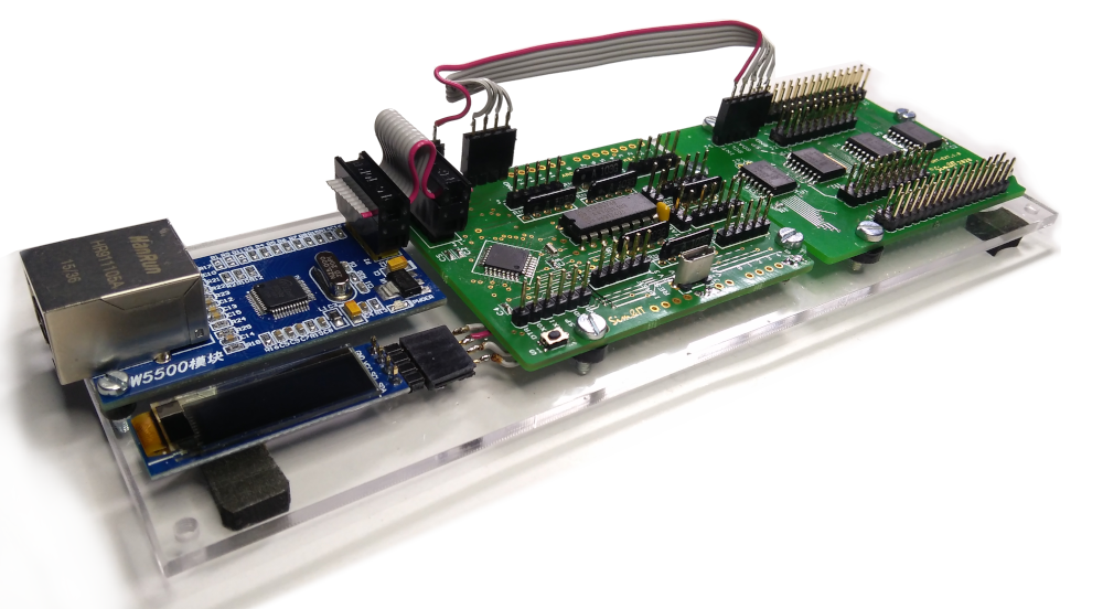 Die Abbildung zeigt den kompletten Aufbau des Controllers mit der Port-Erweiterung und dem Ethernet-Modul. Mit dieser Erweiterung ist es möglich, Schalter des Panels eines Kleinflugzeuges nachzubilden. Dazu zählen u.a. Starter, Lichtschalter, Fuelpump, Tank, Flaps, Gear.