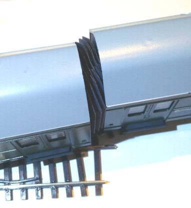 Mit dem originalen Faltenbalg gibt es insbesondere beim Gleiswechsel bei 15°-Weichen odwr bei S-Kurven mit direktem Übergang Probleme. Ich hatte den originalen Faltenbalg mit dessen Faltung mit dünnerem Papier nachgebaut, aber das funktionierte auch nicht. Nach mehreren Versuchen hat sich eine Variante mit zwei Faltungssträngen und einer Klebung oben in der Mitte nach jeweils einer Faltung als erfogversprechend gezeigt. Damit können jetzt auch im Schiebebetrieb S-Kurven mit Radius-545mm und Gleiswechsel mit 15°-Weichen durchfahren werden. Direkte Übergänge bei S-Kurven mit kleinerem Radius sollten vermieden werden. Bei R-380 raschelt der Balg. Da könnten dann Probleme auftreten.