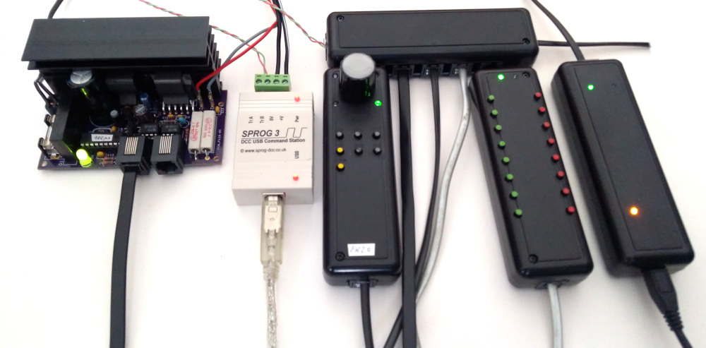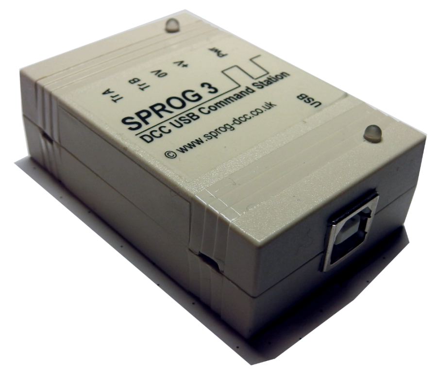 Als Command Station wird SPROG3 eingesetzt. Diese ist über USB an den PC angeschlossen und erscheint als serielles Gerät im Gerätemaneger von Windows. Die DCC-Signale werden an das Gleis geführt, oder als RailSync an einen Booster, der mit dem Gleis verbunden ist. Weiteres hierzu auch unter RSCLD.