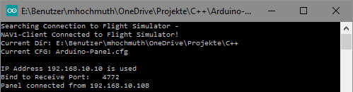 Das Audio-Panel mit dem Arduino-Sketch stellt ein Frontend zum SimConnect-Client bzw. X-Plane-Plugin dar. Das Panel verbindet sich mit der Kommunikations-Software auf dem PC, Ereignisse werden an diese übertragen und die gelieferten Variablen-Werte werden angezeigt.