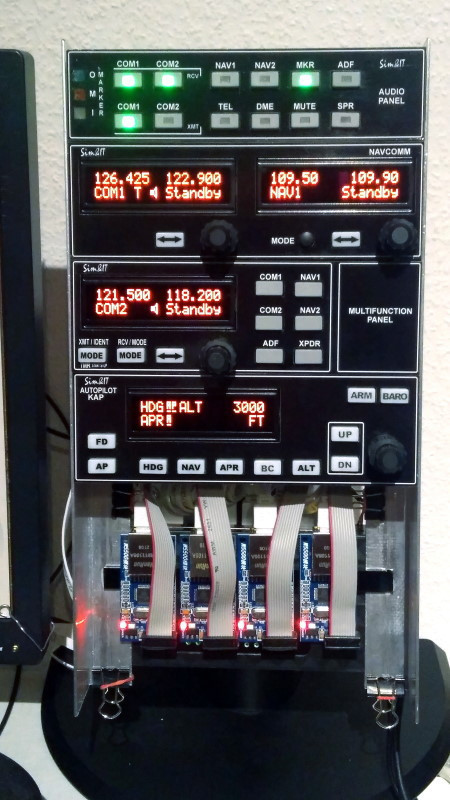 Für die Avionics-Instrumente wird ein Kombinations-Instrument COM1/NAV1 (in Anlehnung an ein KX-165) und ein Multifunktions-Instrument MFP für COM2, NAV2, ADF und Transponder eingesetzt. Dazu kommen ein Audio-Panel (grob angelehnt an KMA-30) und ein Autopilot (in Anlehnung an KAP-140). Die Instrumente basieren auf Arduino-Hardware und kommunizieren über Ethernet mit dem Flugsimulator. Zum MSFS sind SimConnect-Clients die Schnittstelle zwischen Hardware und Flugsimulator, beim X-Plane sind es Plug-Ins.