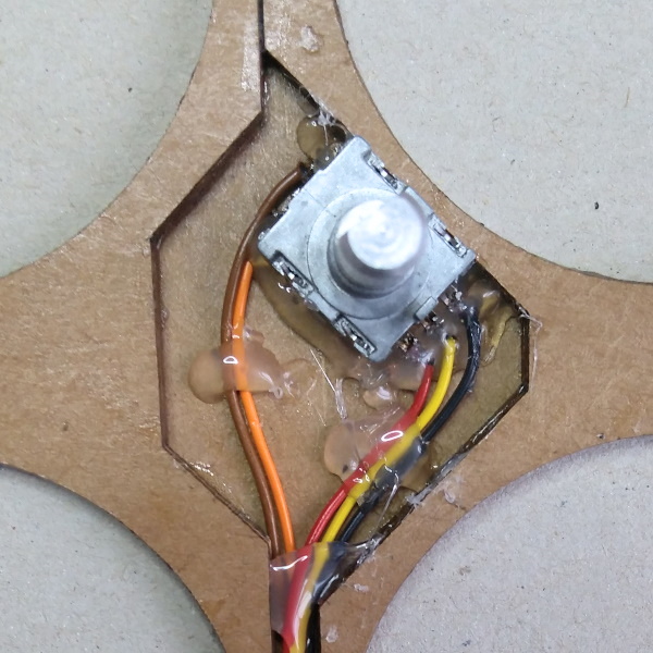 Die Panelmaske wird schichtweise aufgebaut. Auf die untere Lage werden dann die Encoder aufgeklebt und verdrahtet. Dafür sind zwischen den Instrumenten Schlitze vorgesehen.