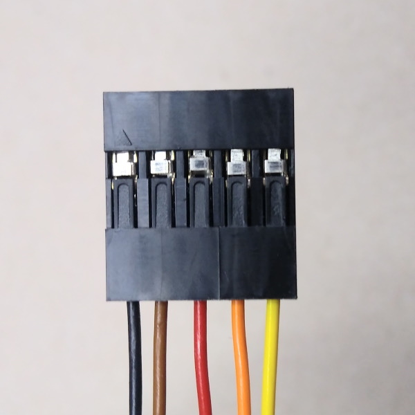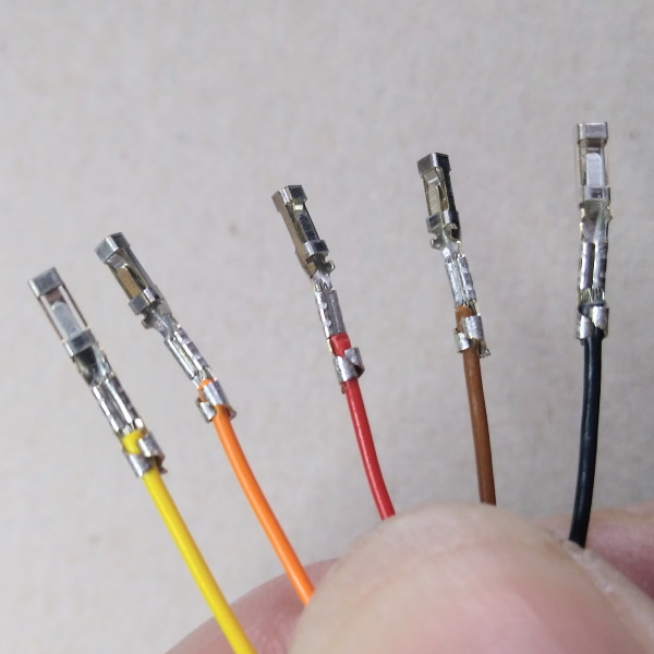 An den Encodern werden die Befestigungsnasen entfernt und die Lötkontakte umgebogen, so dass die Encoder aufgeklebt und die Kabel an den Kontakten angelötet werden können. Der Encoder wird dann in die Maske eingeklebt und mit Heißkleber weiter fixiert. Die Kabel werden ebenfalls mit Heißkleber befestift. Am anderen Ende sind Crimpkontakte angebracht, die dann in eine 5-polige Aufnahme gesteckt werden.