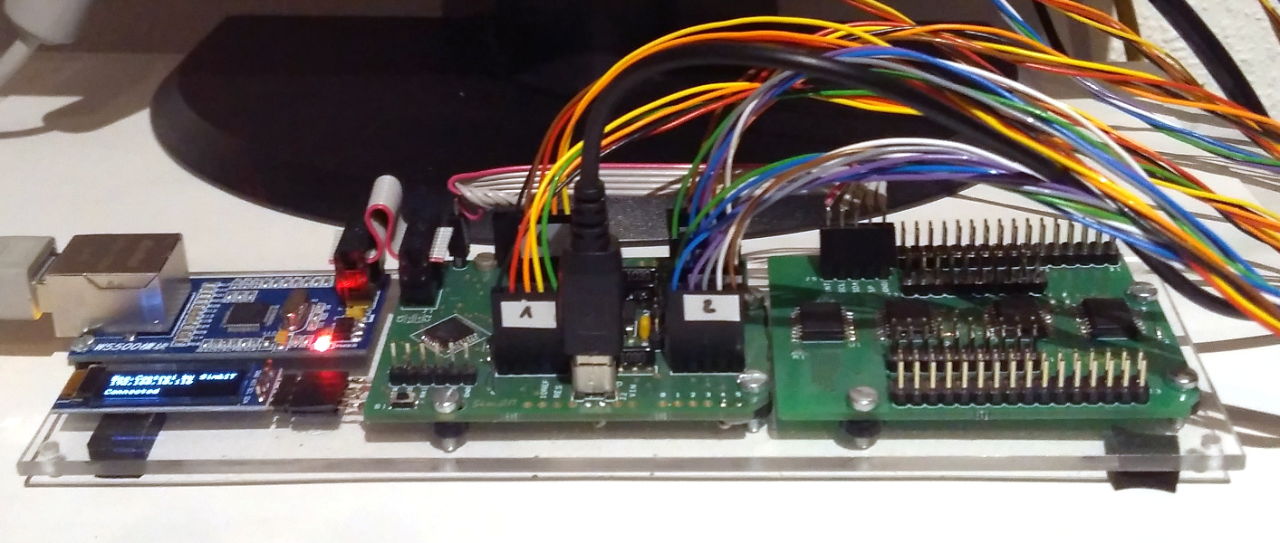 Das TFT-Panel hat sechs Drehimpulsgeber. Für die Verarbeitung der Ereignisse wird der Encoder-Controller auf der Basis eines Arduino eingesetzt. Der Controller kommuniziert über Ethernet mit dem Flugsimulator.