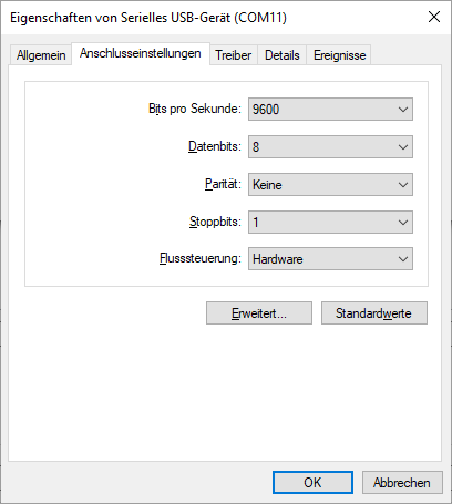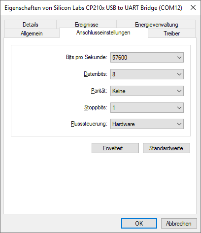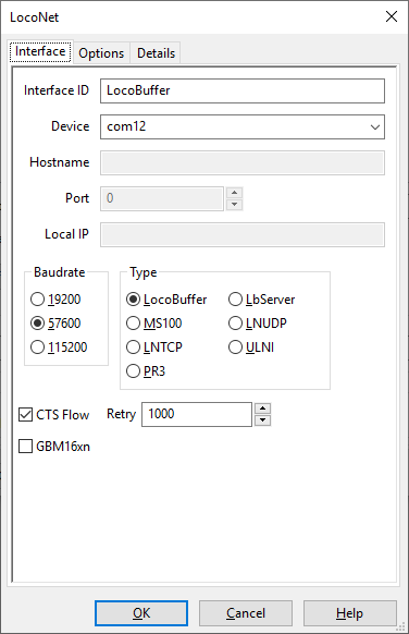 Für den LocoBuffer ist im Betriebs-System die zugehörige serielle Schnittstelle folgendermaßen zu definieren und entsprechend im Rocrail das Interface und die Details einzustellen, die Options sind nicht definiert: