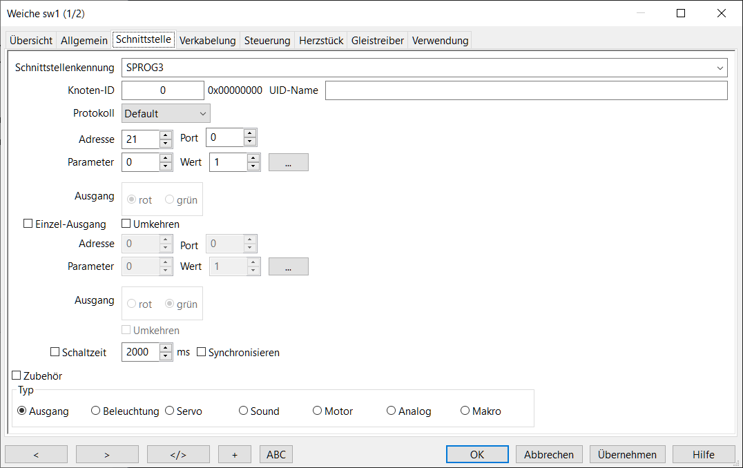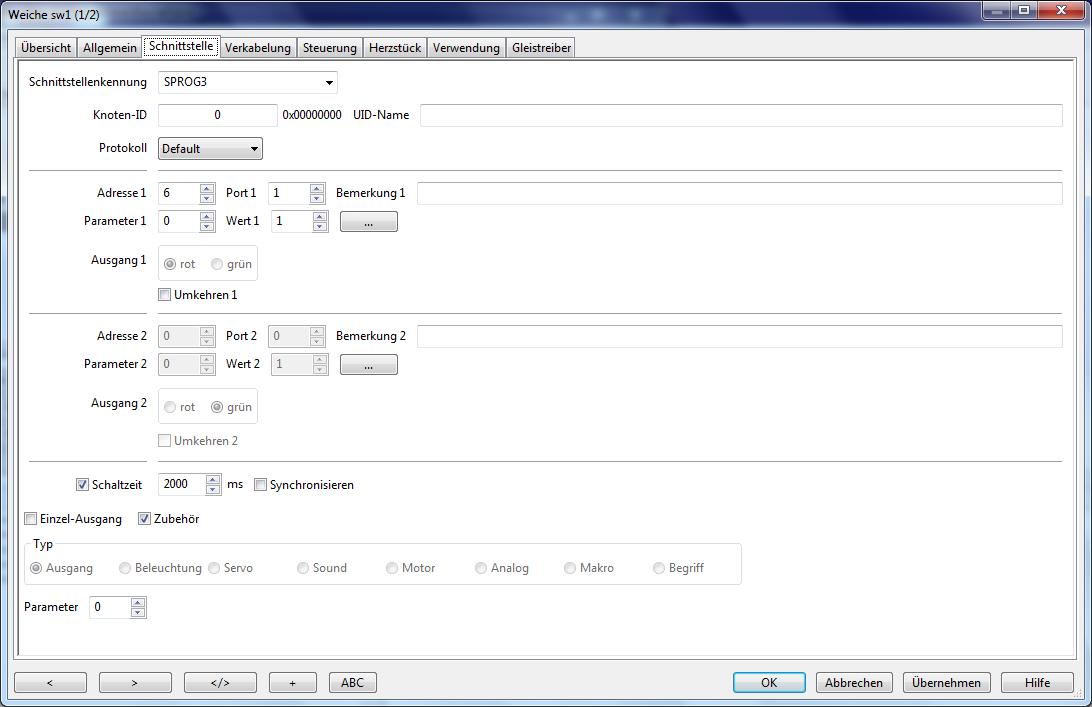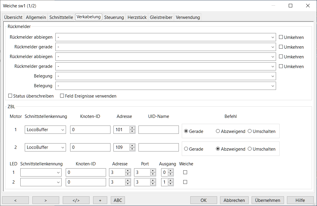 Deshalb wird bei den Eigenschaften der Weiche → Schnittstelle die DCC-Zentrale und die DCC-Adresse des Weichendekoders zugewiesen. Beim Reiter Weiche → Verkabelung wird unter CTC/ZBL der LocoBuffer als Bedienschnittstelle eingegeben, und die Adresse, die das LocoIO-Keypad bei Tastendruck sendet, um die Weiche zu schalten.