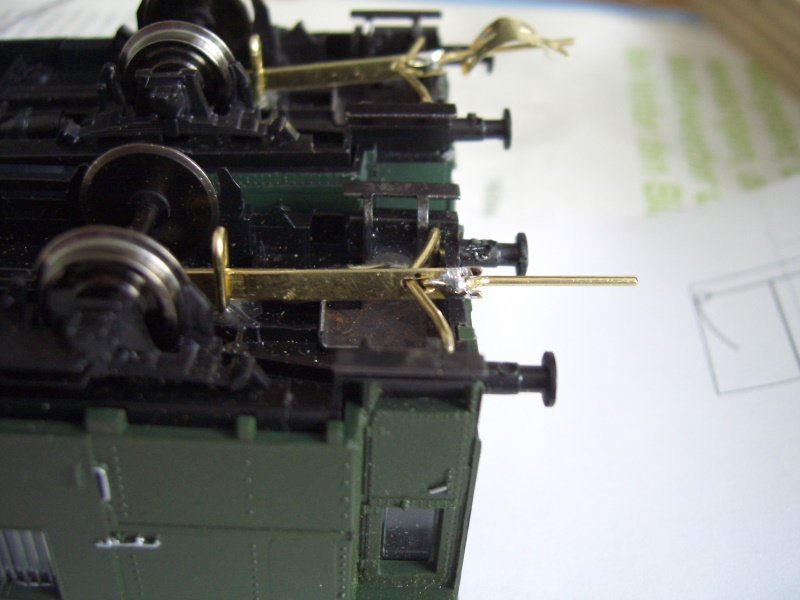 Der Drehpunkt der Deichsel besteht ebenfalls aud Draht, der eine Auf-und Abbewegung und eine seitliche Bewegung ermöglicht. Er ist also mit etwas Spiel gebogen. Führungsdraht und Drehpunkt wurden mit 2K-Kleber angeklebt. Die Deichsel besteht aus einem Blechstreifen, in den ein Draht eingelötet wird. Dieser ist dann so gebogen, dass zwei Wagen mit einem Verbindungsstück verbunden werden können.