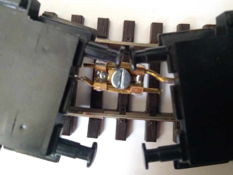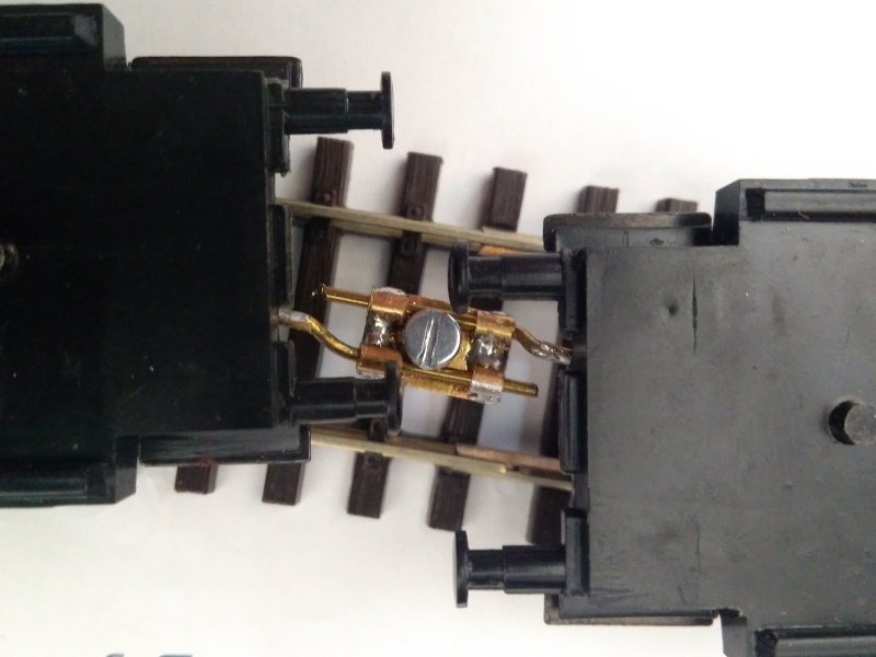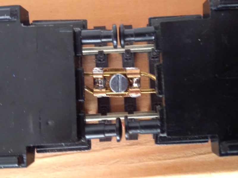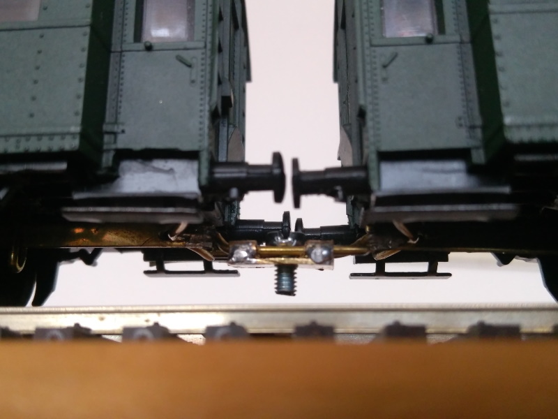 Da sich das Verbindungsstück nicht bewährte, habe ich eine andere Lösung getestet - ein Stück Messing mit 4 Hülsen zur Führung der Deichseldrähte. Eine Schraube verspannt dann beide Drähte (wird noch gekürzt). Diese Lösung funktioniert deutlich besser, das Verbindungsstück kann sich nicht mehr wegdrehen. Der Abstand der Wagen darf nicht zu knapp eingestellt werden, da es sonst beim Schieben in der Kurve z.B. beim Rangieren zum Verhakeln der Puffer kommt. Das Verhalten beim Durchfahren der S-Kurve zeigt einen Extremfall mit R=360.