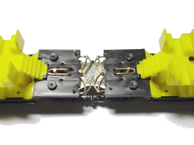 Die Doppelstockwagen haben einen sehr langen Abstand zueinander. Da ich auf meiner Anlage recht kurzeZüge fahren lasse, habe ich eine zweiteilige Einheit umgebaut auf einen kürzeren Abstand. Auf das mittlere Drehgestell, auf dem beide Teile aufliegen, habe ich ein Blech geklebt und mit zwei Zapfen versehen. Aus Draht habe ich die eine Längsführung und die Kulisse gebogen. Die Wagenteile werden auf die beiden Führungszapfen aufgesetzt.