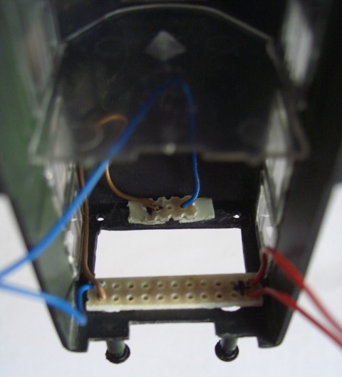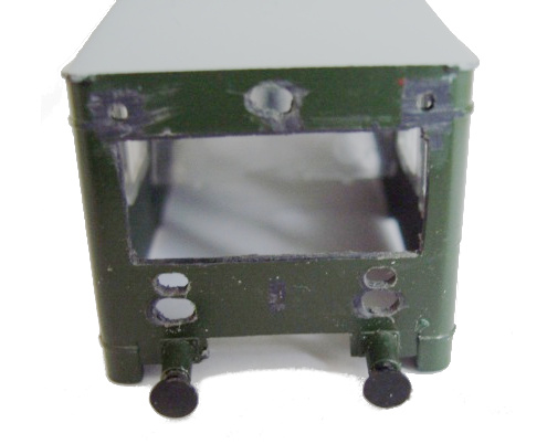 Die Front des Wagens erhält Durchbrüche, die Front wurde lackiert und aufgeklebt. Zusätzlich wurden LEDs für die Beleuchtung eingeklebt. Auf den Bildern sind die LEDs noch kaltweiß (im Foto noch stärkerer Blaustich). Diese LEDs wurden durch warmweiße LEDs ersetzt. Die Durchbrüche wurden mit transparentem Kleber verschlossen.