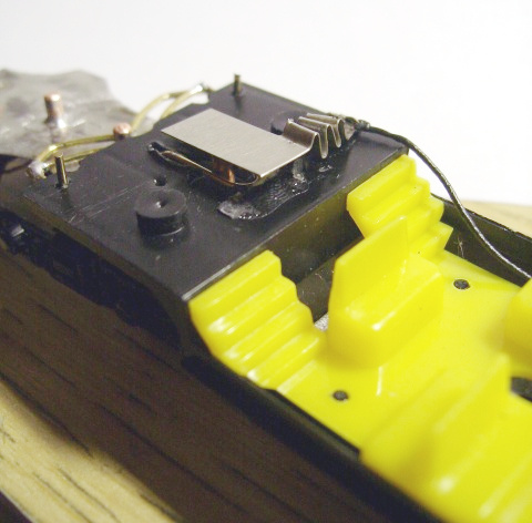 Die eine Kontaktierung erfolgt über das mittlere Drehgestell und wird noch vorn geführt und die zweite Kontaktierung über das vordere Drehgestell. Dazu wurden Federn gebogen, die auf den Stiften aufliegen. So ist das Oberteil problemlos abnehmbar. Die Ansteuerung der LEDs erfolgt über einen ausgesonderten Lok-Dekoder.