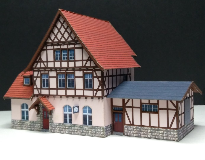 Kartonmodell eines Bahnhofsgebäude aus einem Buch von Günter Fromm „Modellbahn-Bauten“ in Maßstab 1:160. Der Bahnhof heißt im Buch „Kleindembach“. Sein jetziger Name „Langenorla Ost“